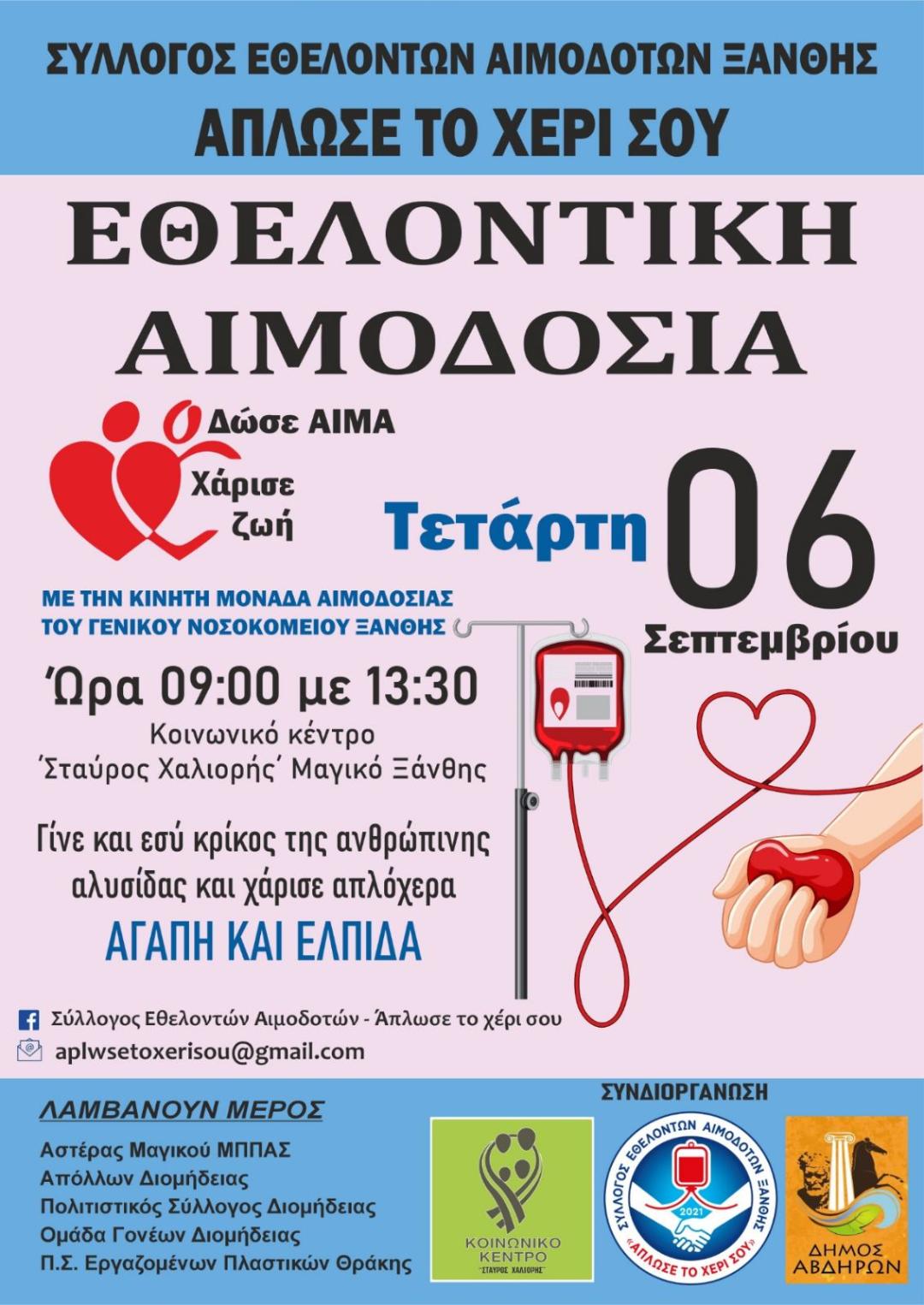 *Η αιμοδοσία θα πραγματοποιηθεί σε συνεργασία με την κινητή μονάδα του Τμήματος Αιμοδοσίας του Γενικού Νοσοκομείου Ξάνθης.