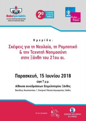 Ο Σύλλογος Ρομποτικής, Μαθηματικών, Φυσικής και Τεχνολογίας Ξάνθης «Robospecialists» σε συνεργασία με την διοργάνωση «Ρολόι των Νέων/City lab 2018” και το 2Ο Λύκειο Ξανθής, έχουν την χαρά να προσκαλέσουν όλους τους πολίτες στην ημερίδα με θέμα: «Σκέψεις για τη Νεολαία, τη Ρομποτική και την Τεχνητή Νοημοσύνη στη Ξάνθη του 21ου αι»