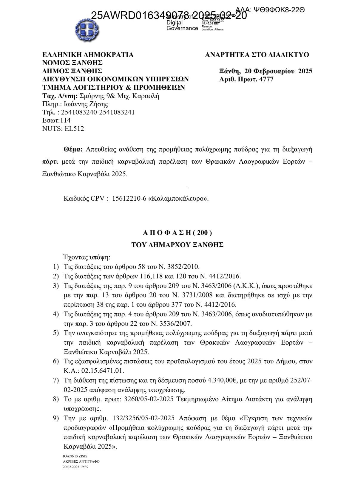 Θέμα: Απευθείας ανάθεση της προμήθειας πολύχρωμης πούδρας για τη διεξαγωγή πάρτι μετά την παιδική καρναβαλική παρέλαση των Θρακικών Λαογραφικών Εορτών – Ξανθιώτικο Καρναβάλι 2025.