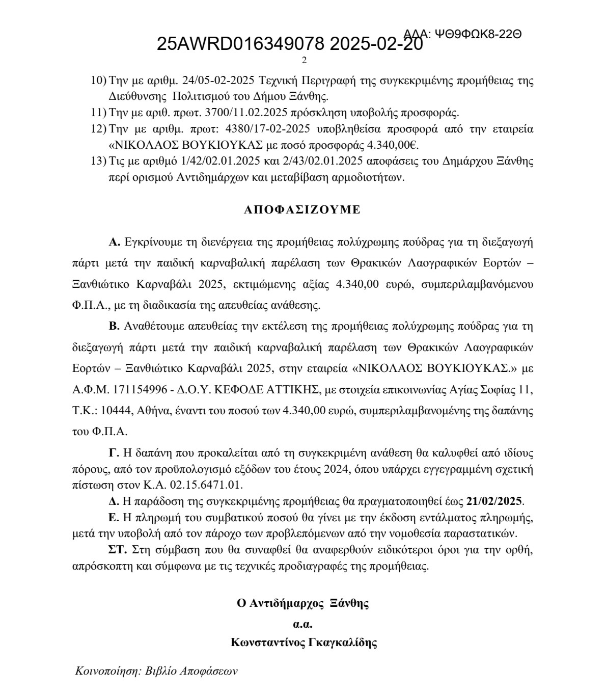 Β. Αναθέτουμε απευθείας την εκτέλεση της προμήθειας πολύχρωμης πούδρας για τη διεξαγωγή πάρτι μετά την παιδική καρναβαλική παρέλαση των Θρακικών Λαογραφικών Εορτών – Ξανθιώτικο Καρναβάλι 2025, στην εταιρεία «ΝΙΚΟΛΑΟΣ ΒΟΥΚΙΟΥΚΑΣ.» με Α.Φ.Μ. 171154996 – Δ.Ο.Υ. ΚΕΦΟΔΕ ΑΤΤΙΚΗΣ, με στοιχεία επικοινωνίας Αγίας Σοφίας 11, Τ.Κ.: 10444, Αθήνα, έναντι του ποσού των 4.340,00 ευρώ, συμπεριλαμβανομένης της δαπάνης του Φ.Π.Α.