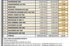 εξέταση ΠΑΕ είχαν το 2014/2015 συνολικά έσοδα 143,41 εκατ. ευρώ, μειωμένα κατά