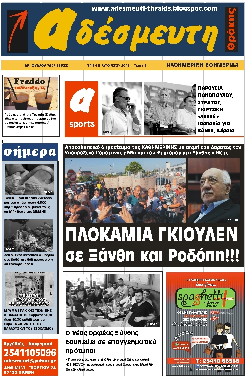 ΠΡΩΤΟΣΕΛΙΔΟ ΕΦΗΜΕΡΙΔΑΣ 8 ΑΥΓΟΥΣΤΟΥ 2016