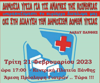 Η Α.Δ.Ε.Δ.Υ. Ξάνθης, καλεί όλα τα Πρωτοβάθμια Σωματεία και τους φορείς της Ξάνθης, να παραστούν στη συγκέντρωση διαμαρτυρίας, που διοργανώνει το Σωματείο Εργαζομένων Νοσοκομείου Ξάνθης, την Τρίτη 21 Φεβρουαρίου 2023 και ώρα 17:00, στη Κεντρική Πλατεία Ξάνθης.