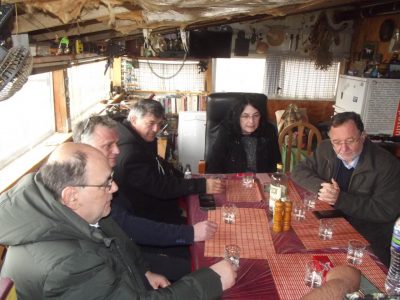 Στην ζεστασιά της καλύβας του Γιώργου Θαλασσινού, μέσα στο ποτάμι, μεταξύ άλλων συζητήσαμε για τις καλύβες του ΔΕΛΤΑ που έχουν βάλει στο μάτι οι δοσίλογοι και ενώ έχουμε να κάνουμε με πραγματικούς ακρίτες, ακριβώς μέσα στο μάτι του κυκλώνα, εθνοφύλακες, ανθρώπους που είναι πραγματικά τα μάτια και τα αυτιά της Ελληνικής αστυνομίας και του στρατού, θέλουν να τους διώξουν από τις καλύβες με απειλή προστίμου 1€ το τετραγωνικό ανά ημέρα! !! Αν δηλαδή μια καλύβα είναι 50 τετραγωνικά, θα πληρώνει ο ιδιοκτήτης 50 ευρώ πρόστιμο την ημέρα. Αυτοί οι άνθρωποι έπρεπε αντί να διώκονται, να επιδοτούνται για το έργο που επιτελούν. Την μεταφορά μας με την βάρκα ανέλαβε ο Σάκης Καμηλάρης αντιπρόεδρος του συλλόγου ΔΕΛΤΑ του Έβρου φυσικά με την συνοδεία του στρατού (https://www.facebook.com/VakisTsiompanidis). Στις Φέρες έγινε συνάντηση με τον Πρόεδρο του Αγροτικού Συλλόγου Αλεξανδρούπολης, κ. Κώστα Αλεξανδρή.