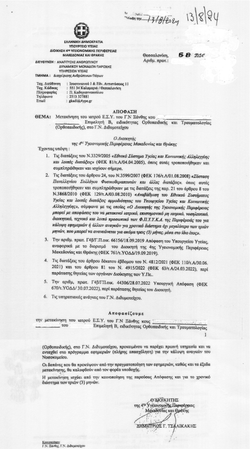 Δείτε παρακάτω τί έλεγε απόφαση του Δ. Τσαλικάκη στις 13/8/2024 για τη μετακίνηση του γιατρού από το Νοσοκομείο της Ξάνθης στο Νοσοκομείο του Διδυμοτείχου όπου στη συνέχεια ακυρώθηκε: