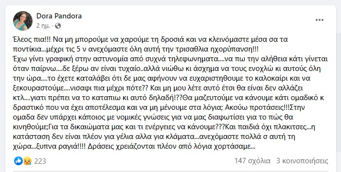Έλεος πια!!! Να μη μπορούμε να χαρούμε τη δροσιά και να κλεινόμαστε μέσα σα τα ποντίκια… μέχρι τις 5 ν ανεχόμαστε όλη αυτή την τρισαθλια ηχορύπανση!!!