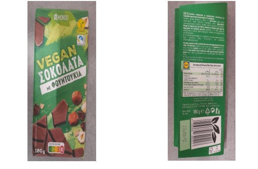 Συγκεκριμένα πρόκειται για το προϊόν «VEGAN ΣΟΚΟΛΑΤΑ ΜΕ ΦΟΥΝΤΟΥΚΙΑ, VEMONDO» σε συσκευασία των 180gr, με αριθμό παρτίδας L 34161a και ημερομηνία ανάλωσης κατά προτίμηση, πριν από 15.04.25 που διακινείται από την Εταιρεία Lidl Hellas.