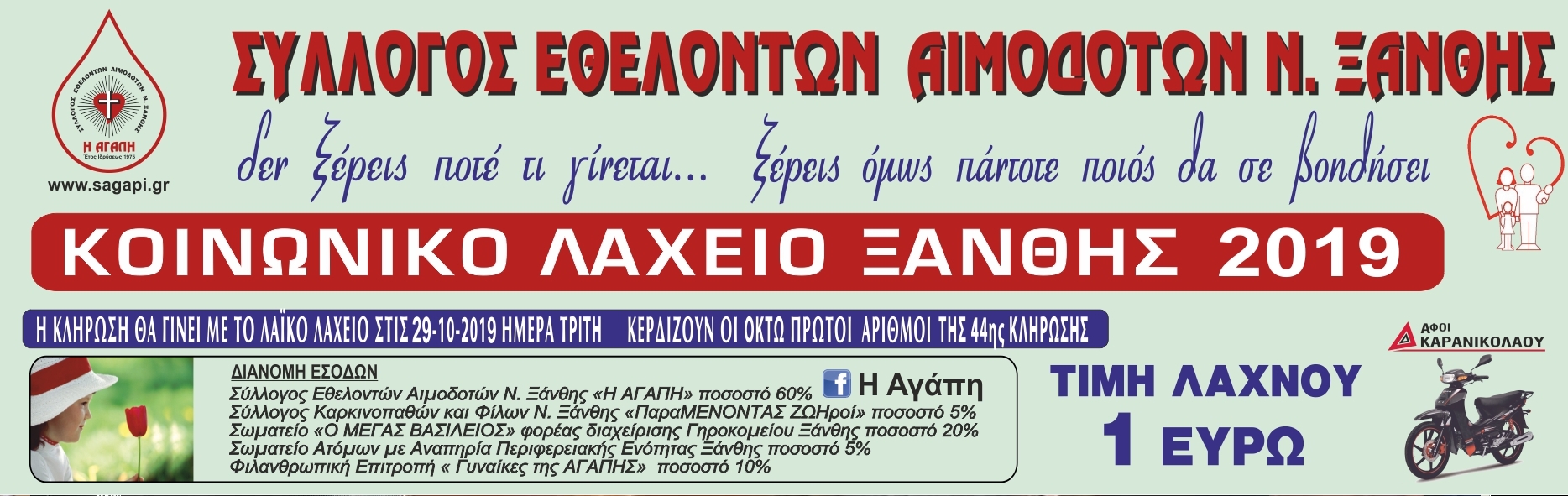 Το Διοικητικό Συμβούλιο του Συλλόγου Εθελοντών Αιμοδοτών Ν. Ξάνθης «Η ΑΓΑΠΗ» ανακοινώνει τους τυχερούς αριθμούς του ΚΟΙΝΩΝΙΚΟΥ ΛΑΧΕΙΟΥ ΞΑΝΘΗΣ 2019 οι οποίοι προέκυψαν από την 44η κλήρωση του Λαϊκού Λαχείου της 29ης Οκτωβρίου 2019. Οι οκτώ τυχεροί αριθμοί που κερδίζουν τα δώρα μας είναι οι κάτωθι: