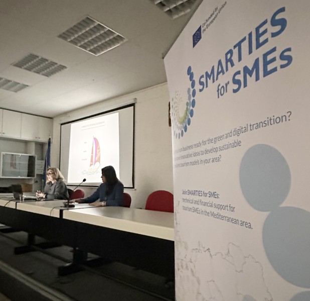 «Το Επιμελητήριο Ξάνθης φιλοξένησε την Τετάρτη 8.01.2025, στην αίθουσα συνεδριάσεών του, μια επιτυχημένη εκδήλωση πληροφόρησης στο πλαίσιο του διακρατικού έργου «SMARTIES for SMEs – Pills of Sustainable, Smart, Regenerative Tourism to Empower SMEs in the EU Mediterranean area», το οποίο συγχρηματοδοτείται από το Πρόγραμμα COSME της Ευρωπαϊκής Ένωσης.