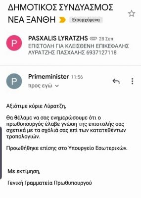 Η ΕΠΙΣΤΟΛΗ ΤΟΥ ΠΑΣΧΑΛΗ ΛΥΡΑΤΖΗ (ΝΕΑ ΞΑΝΘΗ) ΣΤΙΣ 27 ΣΕΠΤΕΜΒΡΙΟΥ ΣΤΟΝ ΠΡΩΘΥΠΟΥΡΓΟ ΚΥΡΙΑΚΟ ΜΗΤΣΟΤΑΚΗ