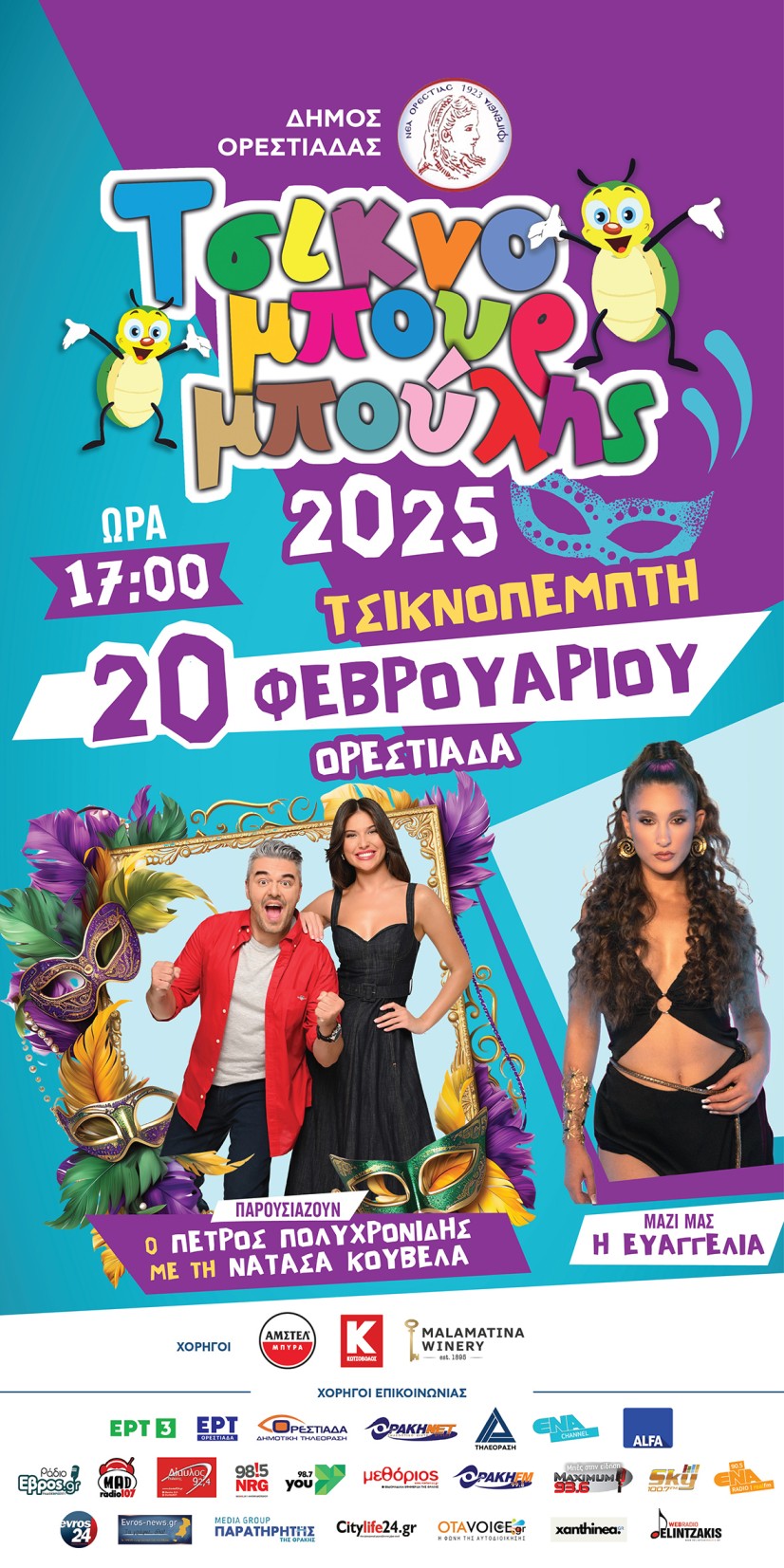 Η έναρξή τους θα πραγματοποιηθεί την Τσικνοπέμπτη, 20 Φεβρουαρίου, με την μεγάλη καρναβαλική παρέλαση του «Τσικνομπουρμπούλη 2025». Από τις 16:00, η κεντρική πλατεία αλλά και οι κεντρικοί δρόμοι της πόλης μας θα πλημμυρίσουν με ήχους και χρώματα, από το μουσικό σύνολο κρουστών του Δημοτικού Ωδείου, τη φιλαρμονική του Δήμου Ορεστιάδας και από DJ. Δημότες και επισκέπτες της πόλης, μικροί και μεγάλοι, θα έχουν την ευκαιρία να συμμετέχουν σε μια γιορτή χαράς δημιουργικότητας και φαντασίας, να τραγουδήσουν, να χορέψουν και να διασκεδάσουν. Η μεγάλη καρναβαλική παρέλαση αποτελούμενη από πολυάριθμα γκρουπ συμμετεχόντων θα ξεκινήσει στις 17:00 από το ύψος του 6ου Δημοτικού Σχολείου Ορεστιάδας (Ευγενίδειο) με κατεύθυνση προς την πλατεία. Ξυλοπόδαροι και ζογκλέρ παρέα με τον πολυαγαπημένο μας Τσικνομπουρμπούλη θα ανοίξουν την παρέλαση και στη συνέχεια, θα ακολουθήσουν τα γκρουπ των συμμετεχόντων, οι οποίοι ντυμένοι με τις πιο πρωτότυπες, δημιουργικές και ξεχωριστές στολές τους θα μεταδώσουν σε όλους τον ρυθμό του καρναβαλιού με κέφι, χορό και διασκέδαση.