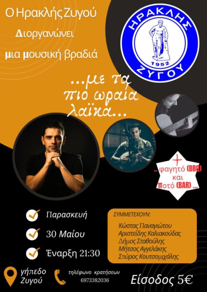 Η ποδοσφαιρική ομάδα του Ηρακλή Ζυγού την Παρασκευή 30 Μαΐου πραγματοποιεί μια μουσική βραδιά. Δείτε τι αναφέρει η πρόσκληση του συλλόγου.