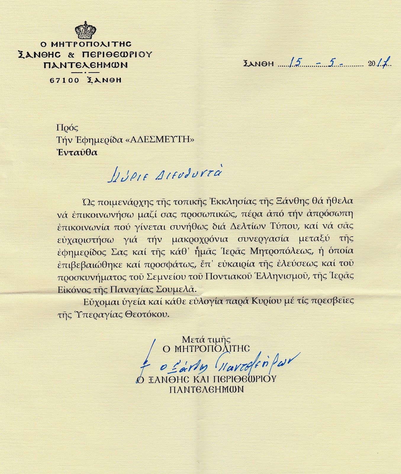 ΕΥΧΑΡΙΣΤΗΡΙΑ ΕΠΙΣΤΟΛΗ ΤΟΥ ΜΗΤΡΟΠΟΛΙΤΗ ΞΑΝΘΗΣ ΣΤΗΝ ΑΔΕΣΜΕΥΤΗ