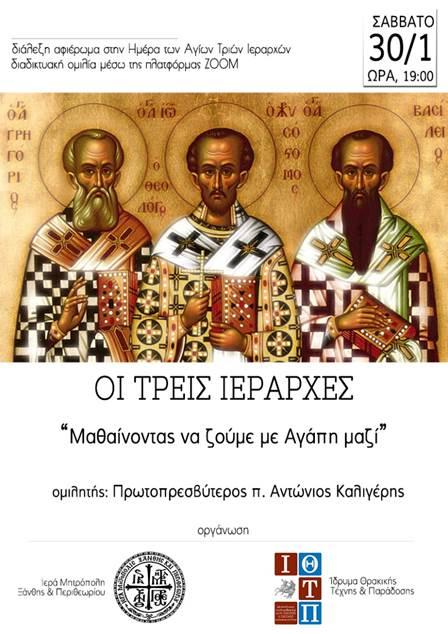 Το Σάββατο 30 Ιανουαρίου 2021, στις 19:00, το Ίδρυμα Θρακικής Τέχνης και η Ιερά Μητρόπολη Ξάνθης και Περιθεωρίου τιμούν την ημέρα του εορτασμού των Αγίων Τριών Ιεραρχών και φιλοξενούν τον Πρωτοπρεσβύτερο π. Αντώνιο Καλιγέρη σε διαδικτυακή ομιλία με τίτλο: