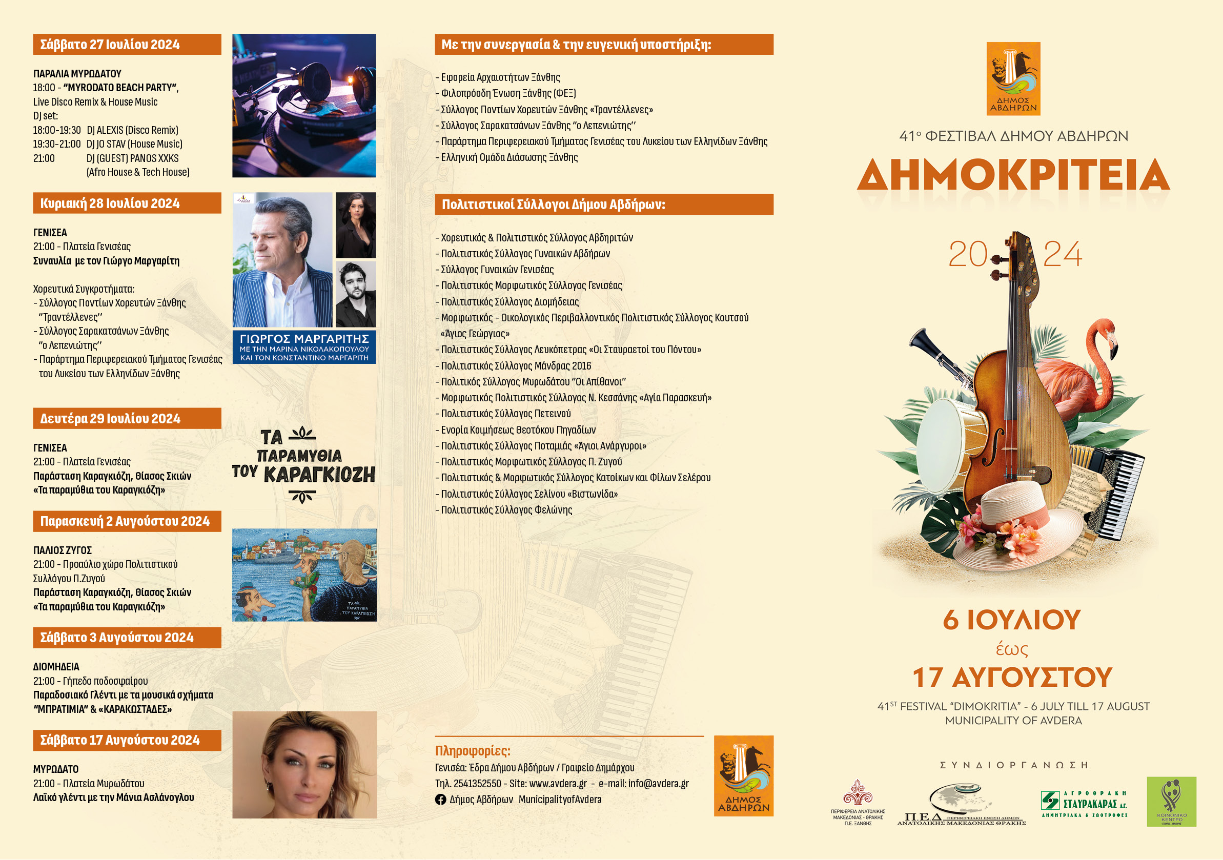 Από τον Δήμο Αβδήρων δόθηκε στη δημοσιότητα το πρόγραμμα των εκδηλώσεων για τα φετινά Δημοκρίτεια 2024, που ξεκινούν στις 6 Ιουλίου και ολοκληρώνονται στις 17 Αυγούστου.