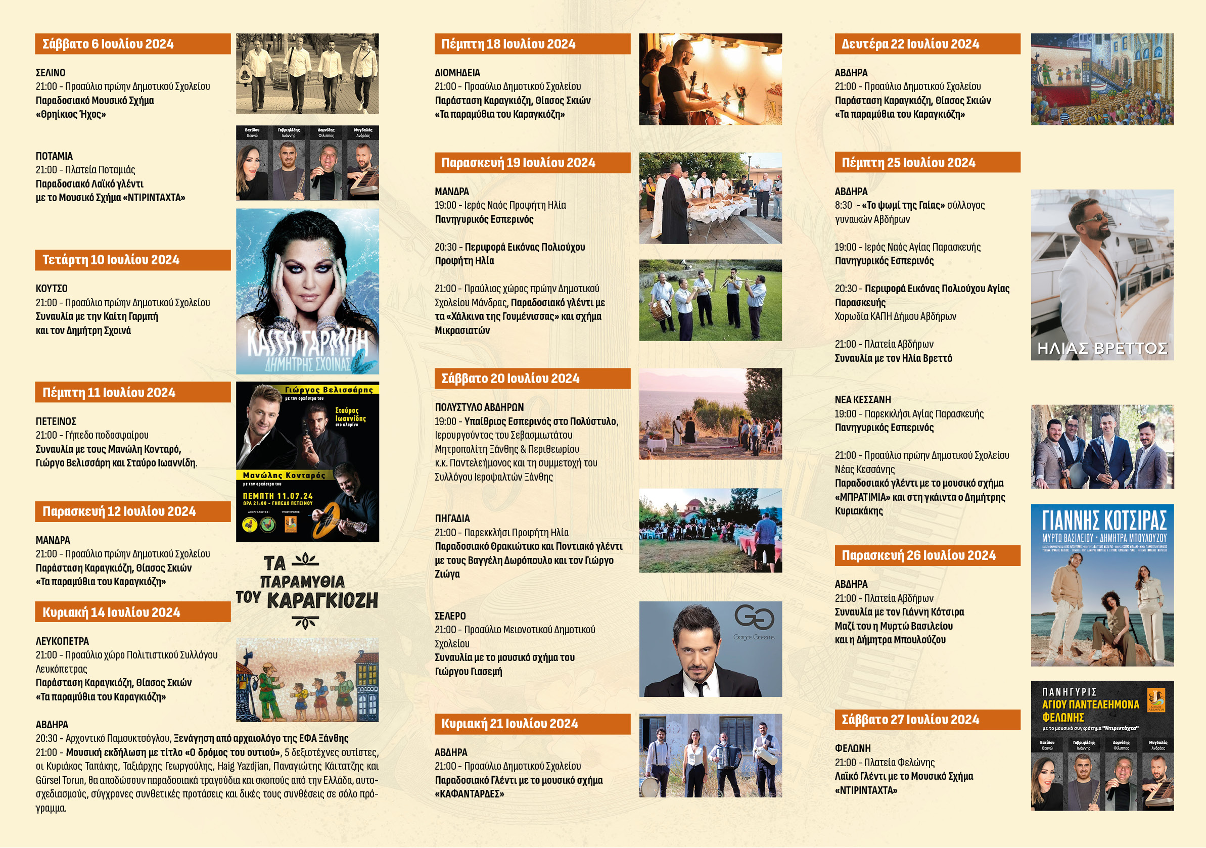 Το φετινό πρόγραμμα είναι ιδιαίτερα πλούσιο και περιλαμβάνει συναυλίες με μεγάλα ονόματα της ελληνικής μουσικής σκηνής, καθώς και πλήθος άλλων πολιτιστικών και λαογραφικών εκδηλώσεων.