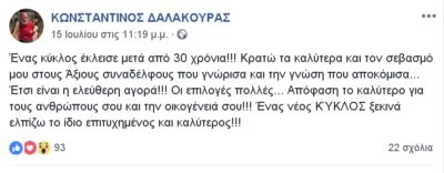 Τέλος σημειώνεται ότι στις 15 Ιουλίου 2018  ο Κώστας Δαλακούρας που είχε πολυ αισιοδοξία και αγάπη για την ζωή με ανάρτησή του  στο fb μιλούσε για έναν νέο κύκλο που ξεκινάει για τον ίδιο –γεγονός που απέκλειε την αυτοκτονία- αναφέροντας τα παρακάτω: