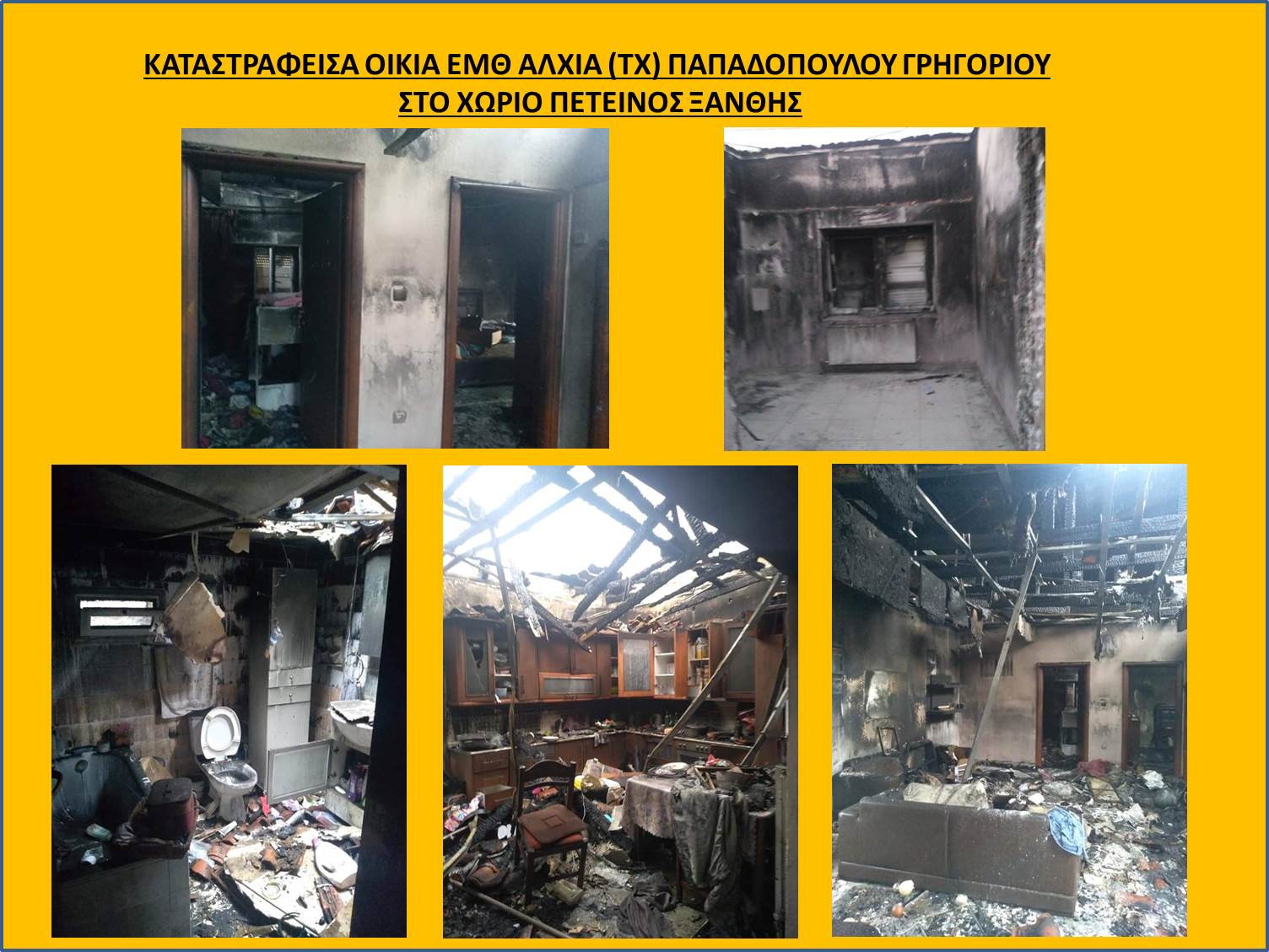 Αγαπητοί Συνάδελφοι και Φίλοι μας, στην Ελλάδα και το Εξωτερικό, σας πληροφορούμε για την ολοσχερή καταστροφή από πυρκαγιά, στις 27 Δεκ.2018, της οικίας του ΕΜΘ Αρχιλοχία (ΤΧ). Παπαδόπουλου Γρηγορίου, στο χωριό ΠΕΤΕΙΝΟΣ Ξάνθης. Η οικογένεια του αποτελείται από τη σύζυγό του Ελένη Κακλαμάνου (άνεργη), τα δύο (2) ανήλικα παιδιά από τα οποία το 1 πάσχει από σοβαρό αυτοάνοσο νόσημα και την πεθερά με κινητική αναπηρία 85% (κατάκοιτη).