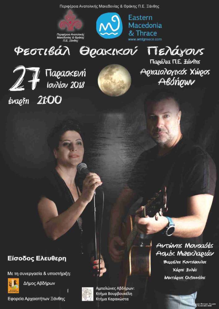 Σας προσκαλούμε στον αρχαιολογικό χώρο των Αβδήρων την Παρασκευή 27 Ιουλίου, στις 21:00, για να απολαύσουμε όλοι μαζί υπό το φως της πανσελήνου συναυλία με τον Αντώνη Μουσαδέ, την Ασμίκ Μπεκλαριάν, τον Βαγγέλη Κοντόπουλο, τον Χάρη Ξυλά και τον Νεκτάριο Ουζουνίδη, στο πλαίσιο του Φεστιβάλ Θρακικού Πελάγους, που διοργανώνει η Περιφερειακή Ενότητα Ξάνθης, σε συνεργασία με τον Δήμο Αβδήρων και την Εφορεία Αρχαιοτήτων Ξάνθης.