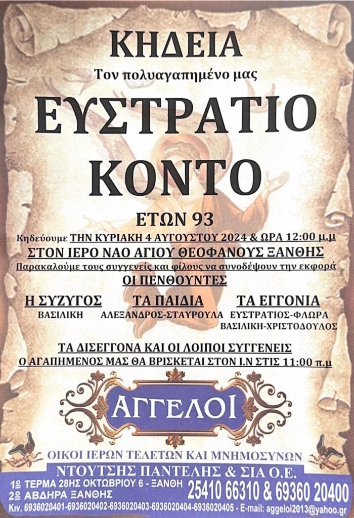 Η κηδεία του “παππού¨Στράτου Κοντού θα γίνει την Κυριακή 4 Αυγούστου στις 12.00 το μεσημέρι στον Ιερό Ναό Αγίου Θεοφάνους, στα Στρατόπεδα προς τη Χρύσα.