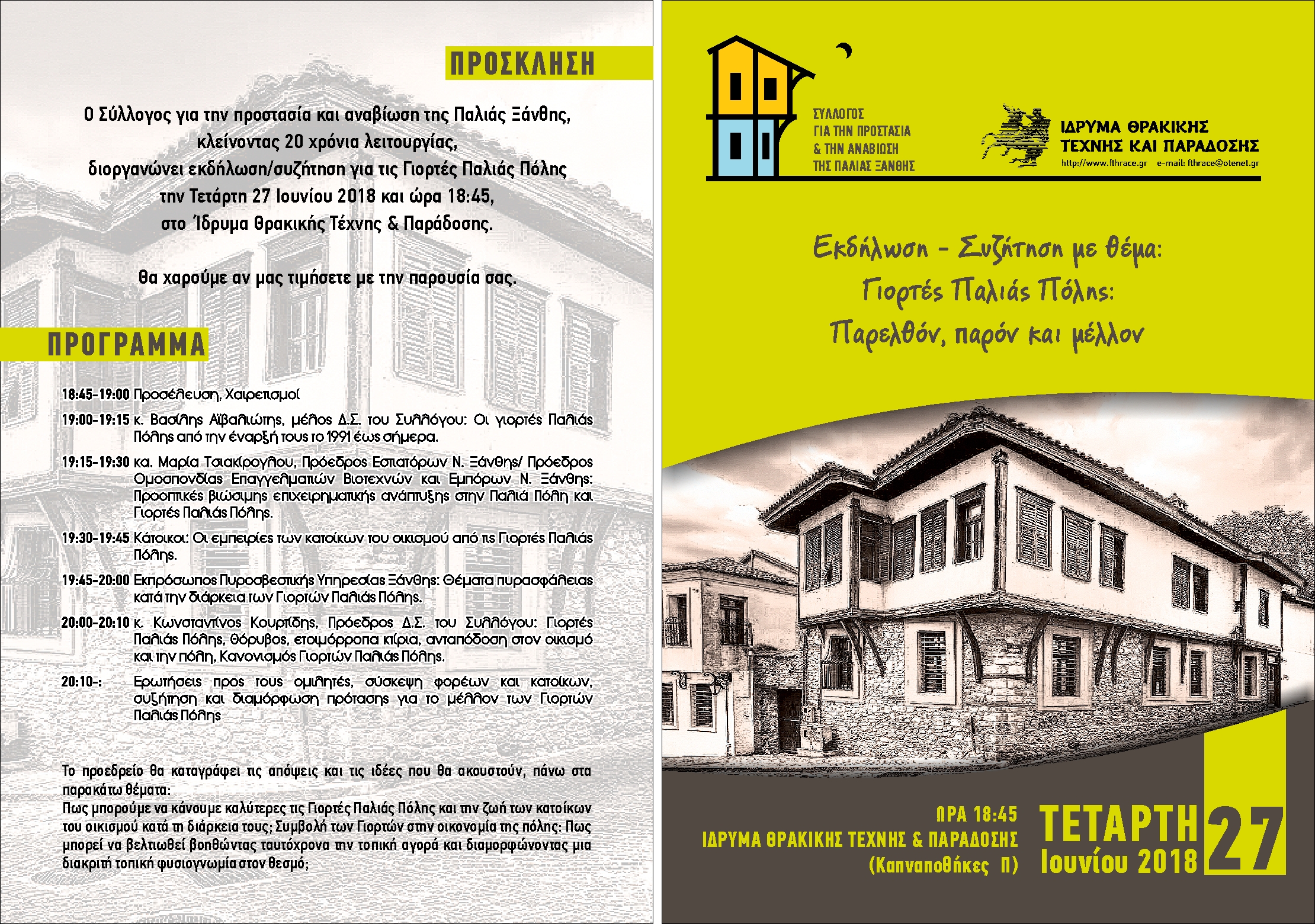 O Σύλλογος για την Προστασία και Αναβίωση της Παλιάς Ξάνθης, κλείνοντας 20 χρόνια λειτουργίας, διοργανώνει Εκδήλωση/συζήτηση για τις Γιορτές Παλιάς Πόλης την Τετάρτη 27 Ιουνίου 2018, 18:45, στο Ίδρυμα Θρακικής Τέχνης και Παράδοσης (Καπναποθήκες Π).