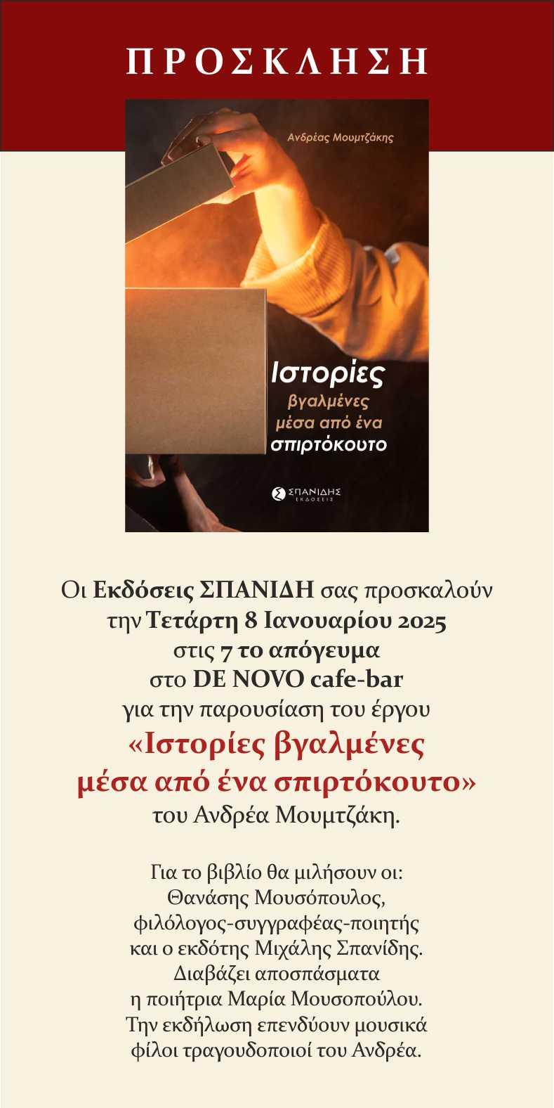 Οι Εκδόσεις ΣΠΑΝΙΔΗ προσκαλούν την Τετάρτη 8 Ιανουαρίου 2025 στις 7:00 το απόγευμα στο De Novo Café Bar στην Ξάνθη.