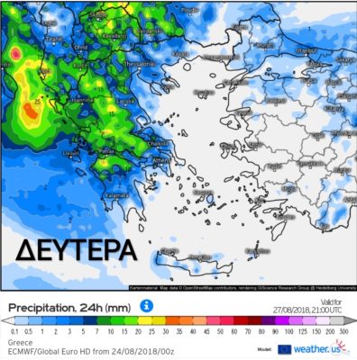 «Πρόσκαιρη επιδείνωση του καιρού αύριο Δευτέρα (27-08-2018) και μεθαύριο Τρίτη (28-08-2018) με κύρια χαρακτηριστικά τις βροχές και καταιγίδες οι οποίες κατά τόπους θα είναι ισχυρές και δεν αποκλείεται να συνοδεύονται από χαλαζοπτώσεις και πολύ ισχυρούς ανέμους.