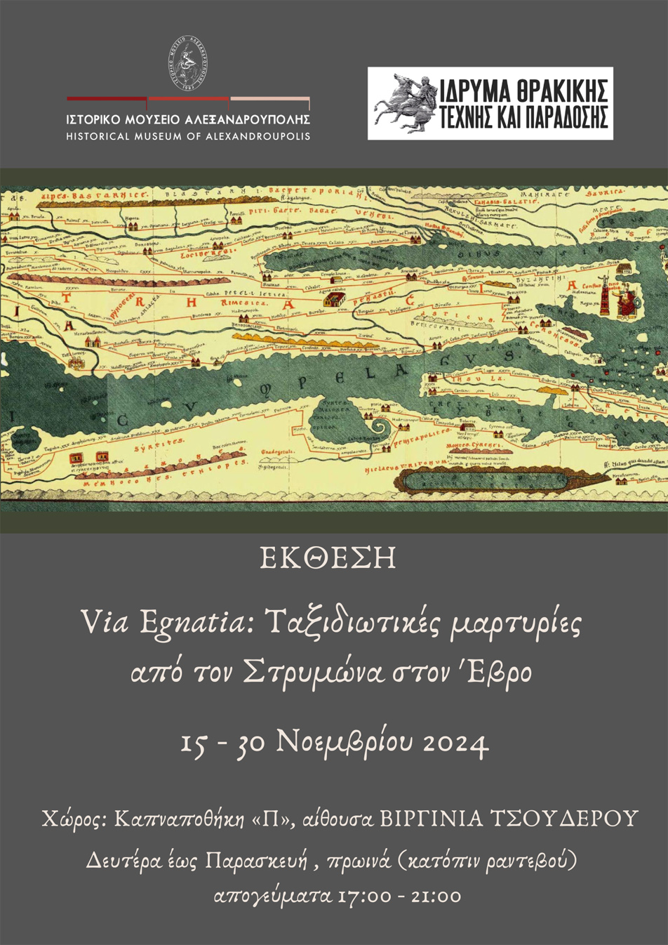 Το Ίδρυμα Θρακικής Τέχνης και Παράδοσης και το Ιστορικό Μουσείο Αλεξανδρούπολης παρουσιάζουν την έκθεση με τίτλο «Via Egnatia: Ταξιδιωτικές μαρτυρίες από τον Στρυμόνα στον Έβρο».