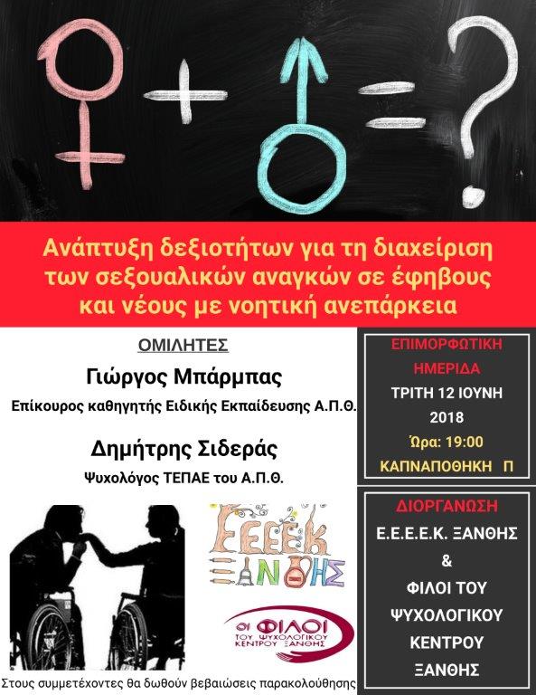 Το Ε.Ε.Ε.Ε.Κ Γενισέας Ξάνθης, ως συνέχεια παλαιότερης ημερίδας με αντίστοιχο θέμα και ο Σύλλογος «Οι φίλοι του Ψυχολογικού Κέντρου Ξάνθης» σας προσκαλούν στην Επιμορφωτική Ημερίδα με θέμα: « Ανάπτυξη δεξιοτήτων για τη διαχείριση των σεξουαλικών αναγκών σε εφήβους και νέους με νοητική ανεπάρκεια» που θα πραγματοποιηθεί την Τρίτη 12 Ιουνίου 2018 ώρα 19:00 στην Καπναποθήκη Π.