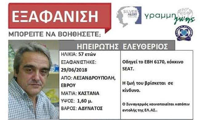 Αίσιο τέλος είχε τελικά η υπόθεση της εξαφάνισης ενηλίκου από την Αλεξανδρούπολη, αφού βρέθηκε το μεσημέρι της Πέμπτης ο αγνοούμενος Λευτέρης Ηπειρώτης.