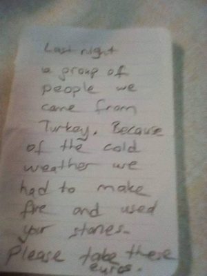 «Χθες το βράδυ μια ομάδα ανθρώπων ήρθαμε από την Τουρκία. Εξαιτίας του κρύου έπρεπε να ανάψουμε μια φωτιά και χρησιμοποιήσαμε τα ξύλα σας. Παρακαλώ δεχτείτε αυτά τα ευρώ».