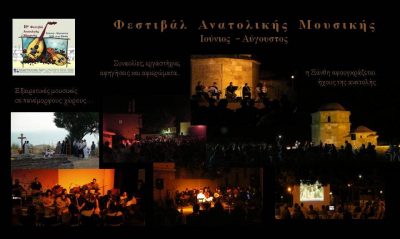 Τo φεστιβάλ ανατολικής μουσικής οργανώνει το πρόγραμμά του, με ένα πλήθος εκδηλώσεων κατά την περίοδο του καλοκαιριού. Περιλαμβάνοντας συναυλίες, εκθέσεις, παρουσιάσεις βιβλίων, διαλέξεις, παραστάσεις και σεμινάρια που αναδεικνύουν την μακραίωνη συγγένεια μουσικών και όχι μόνο παραδόσεων του τόπου μας με αντίστοιχες της Ανατολής. Ψαλτοτράγουδα και συνθέσεις μεγάλων δημιουργών της ορθόδοξης εκκλησιαστικής μουσικής, συνθέσεις λόγιας ανατολικής μουσικής Ρωμιών, Τούρκων, Αρμενίων, Εβραίων και Αράβων συνθετών, μουσικές των Μεβλεβί και Μπεκτασί δερβίσηδων και σεφαραδίτικα τραγούδια δίνουν μία πλούσια εικόνα της πολυπολιτισμικής περιοχής μας. Την μουσικολογική τεκμηρίωση της συγγένειας των παραδόσεων της ευρύτερης περιοχής της ανατολικής μεσογείου συνεχίζουν τα σεμινάρια τροπικότητας, ρυθμολογίας και ανατολικών οργάνων που πραγματοποιούνται κάθε χρόνο. Παράλληλα, στο πλαίσιο του φεστιβάλ, γίνονται παρουσιάσεις, στοιχείων ιστορίας και των ιδιαιτεροτήτων των κατοίκων της περιοχής, όπως Μικρασιατών, Αρμενίων, Ποντίων κ.ά και εκδηλώσεις που συμπληρώσουν την προσπάθεια να αποτυπωθεί μια συνολικότερη εικόνα της καθ’ ημάς Ανατολής.