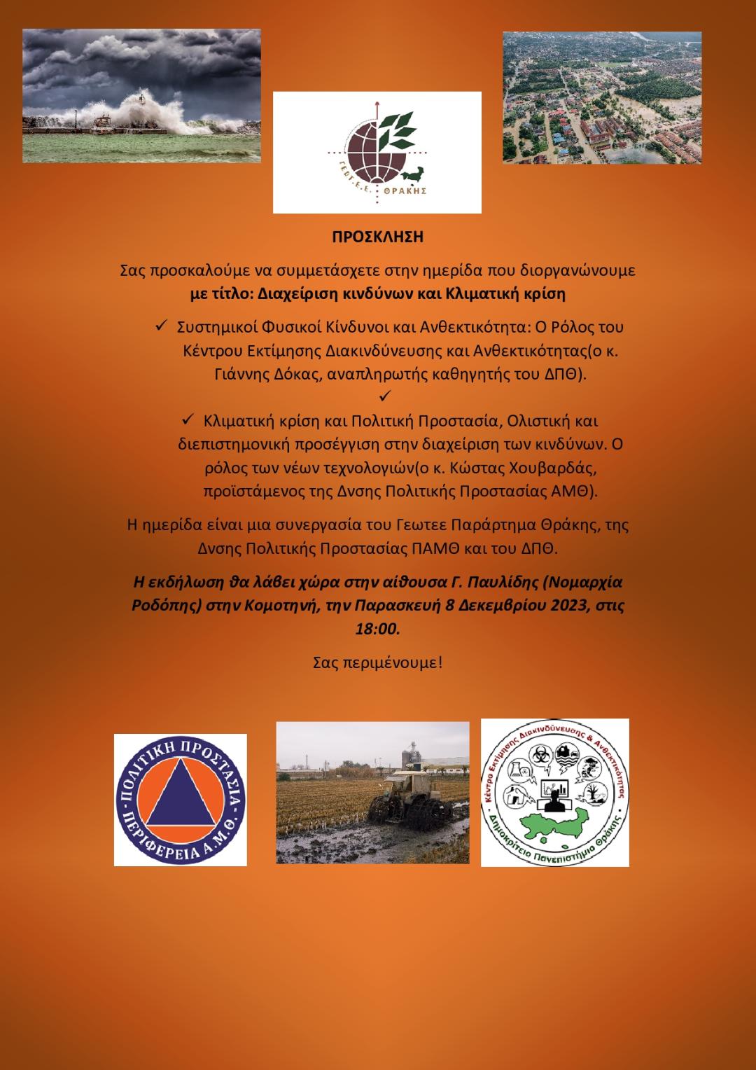 ΓΕΩΤΕΕ – Παράρτημα Θράκης: Ημερίδα με τίτλο, «Διαχείριση κινδύνων και Κλιματική κρίση» (8/12/2023)