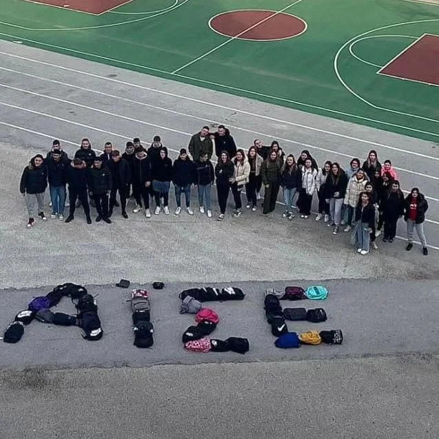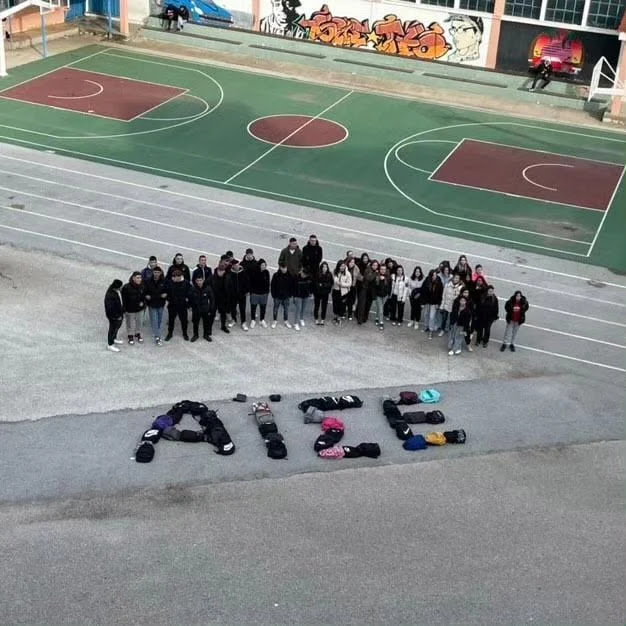 Στη μνήμη της αδικοχαμένης Αϊσέ, οι μαθητές των τμημάτων ΒΥ2, ΒΥ3 σχημάτισαν με τις τσάντες τους το όνομά της στην αυλή του σχολείου τους.