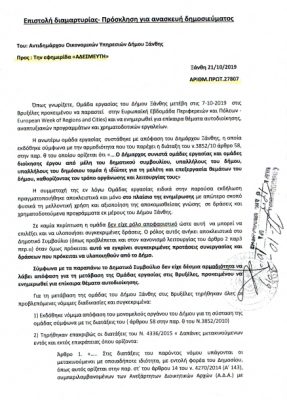 Σας καλούμε εντός τριών (3) ημερών από τη λήψη της παρούσας επιστολής να ανασκευάσετε το δημοσίευμα αναφορικά με τη μετάβαση της ομάδας εργασίας του Δήμου Ξάνθης στις Βρυξέλες στις 7-10-2019, αναφέροντας συγκεκριμένα ότι αυτή πραγματοποιήθηκε στο πλαίσιο της Ευρωπαϊκής Εβδομάδας Περιφερειών και Πόλεων- European Week of Regions and Cities), προκειμένου να ενημερωθεί για επίκαιρα θέματα αυτοδιοίκησης, αναπτυξιακών προγραμμάτων και χρηματοδοτικών εργαλείων και ότι η μετάβαση αυτή έγινε νομότυπα με απόφαση και έγκριση της Οικονομικής Επιτροπής του Δήμου Ξάνθης.