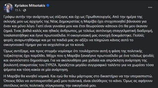 Ενώ αναφέρει: «Από την ημέρα της εκλογής μου ως αρχηγός της Νέας Δημοκρατίας η Μαρέβα έχει στοχοποιηθεί βάναυσα για έναν και μόνο λόγο. Γιατί είναι γυναίκα μου και έτσι θεωρούσαν κάποιοι ότι θα μου έκαναν ζημιά.