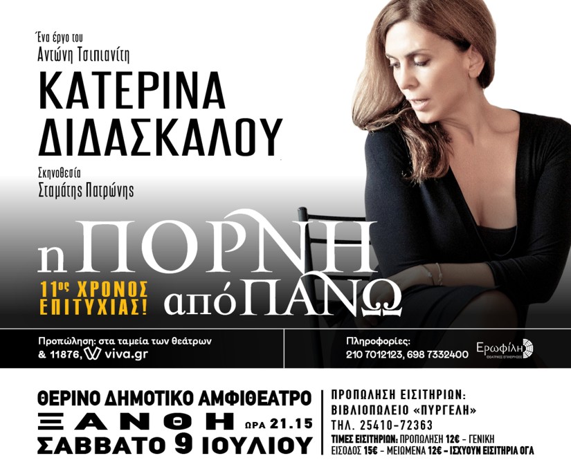 Έντεκα χρόνια τώρα, ο αριστουργηματικός μονόλογος του Αντώνη Τσιπιανίτη Η ΠΟΡΝΗ ΑΠΟ ΠΑΝΩ, με την εξαιρετική Κατερίνα Διδασκάλου, ενθουσιάζει και συγκινεί το κοινό που αγαπά το καλό θέατρο. Έντεκα χρόνια τώρα, τα σημαντικά μηνύματα του έργου περνούν στους θεατές μέσα από το χιούμορ, την συγκίνηση, ένα καταπληκτικό, βαθιά ανθρώπινο κείμενο και μια συγκλονιστική ερμηνεία. Η προδοσία, η απόρριψη, η βαναυσότητα εναντίον των γυναικών και ταυτόχρονα ο έρωτας, η δύναμη που βρίσκει κανείς μέσα του ακόμη και στις δυσκολίες και η επιδίωξη για την χαρά της ζωής ξετυλίγονται συναρπαστικά μέσα από την αφήγηση μιας γυναίκας που μέσα από τον δύσκολο γάμο της έχασε πολλά, κέρδισε όμως τον εαυτό της.