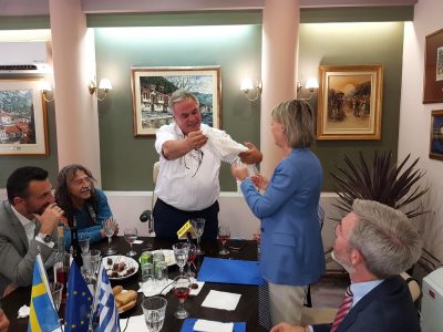 Παρόντες από τη Διοίκηση του ΕΒΕ πλην του Προέδρου Στέλιου Μωραίτη, ο Οικονομικός επόπτης Σπύρος Κάλφας, ο Χρήστος Παμπουκίδης, η Μαριάνθη Μαλλιαρουδάκη, ο Κώστας Καφετζής και ο Σάκης Ζαίτίδης που έδειξε την «τέχνη» του και σερβίροντας κρασί στην Σουηδό πρέσβη και την ακολουθία της.
