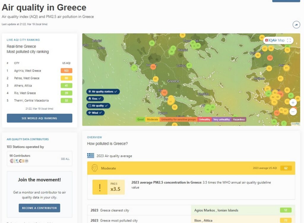 H Ελλάδα καταλαμβάνει την 79η θέση της παγκόσμιας κατάταξης των χωρών με τον πιο μολυσμένο αέρα, σύμφωνα με την live καταγραφή του το βράδυ της Τρίτης (19/3), κάτι που σημαίνει ότι βρίσκεται αρκετά μακριά από τις χώρες που αποτελούν πρότυπο.