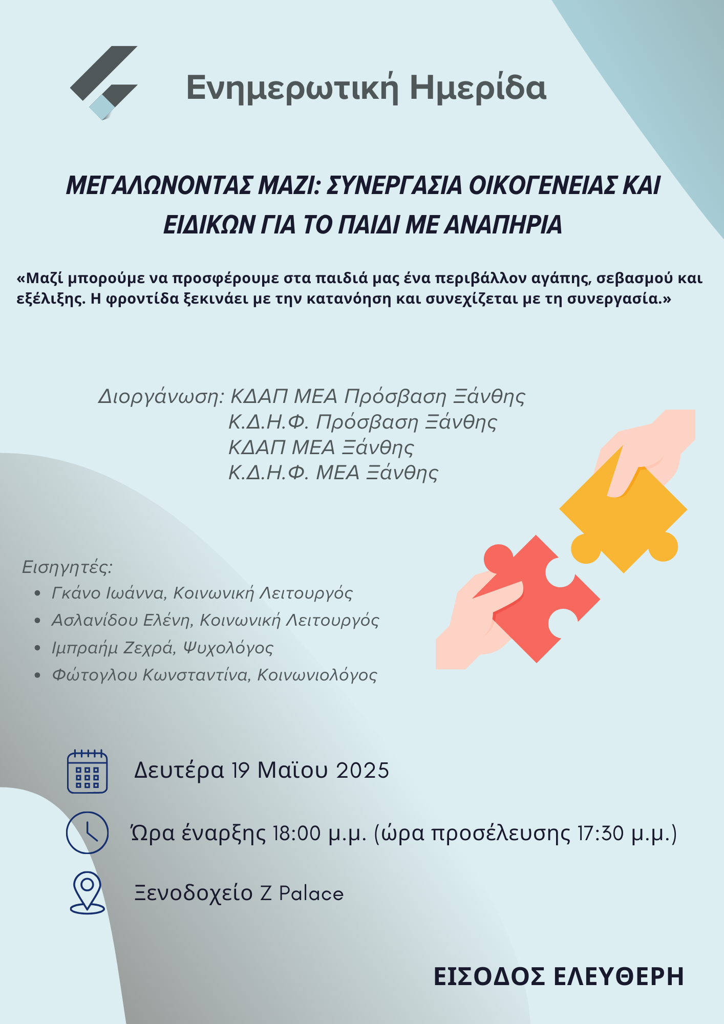 «Μεγαλώνοντας Μαζί: Συνεργασία Οικογένειας και Ειδικών για το Παιδί με Αναπηρία»,