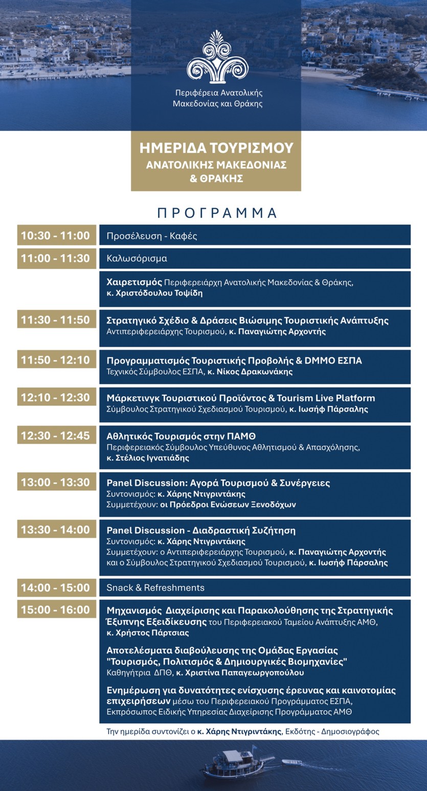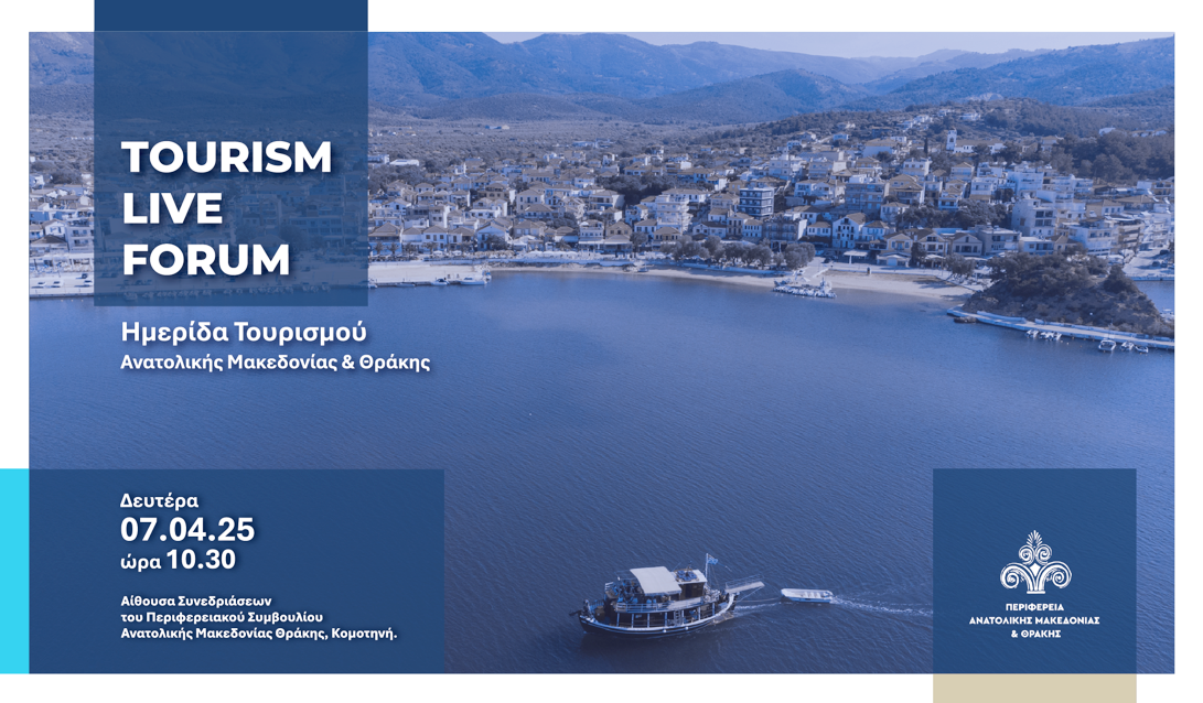 Η Περιφέρεια Ανατολικής Μακεδονίας και Θράκης διοργανώνει την Ημερίδα Τουρισμού «TOURISM LIVE | Στρατηγικός Σχεδιασμός & Διάλογος σε Πραγματικό Χρόνο», μια κομβική συνάντηση στρατηγικής, δικτύωσης και συνεργασίας, όπου θα παρουσιαστούν οι βασικοί άξονες της νέας τουριστικής πολιτικής της Περιφέρειας, καθώς και σύγχρονες μέθοδοι ανάπτυξης και διαχείρισης προορισμών, εισάγοντας ένα νέο μοντέλο συμμετοχής, διαλόγου και τουριστικής διακυβέρνησης. Η Περιφέρεια Ανατολικής Μακεδονίας και Θράκης επενδύει στη συμμετοχική διακυβέρνηση στον τουρισμό, επιδιώκοντας και προσδοκώντας οι φορείς, οι επαγγελματίες και η τοπική κοινωνία να έχουν ενεργό ρόλο στη χάραξη τουριστικών πολιτικών.