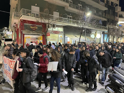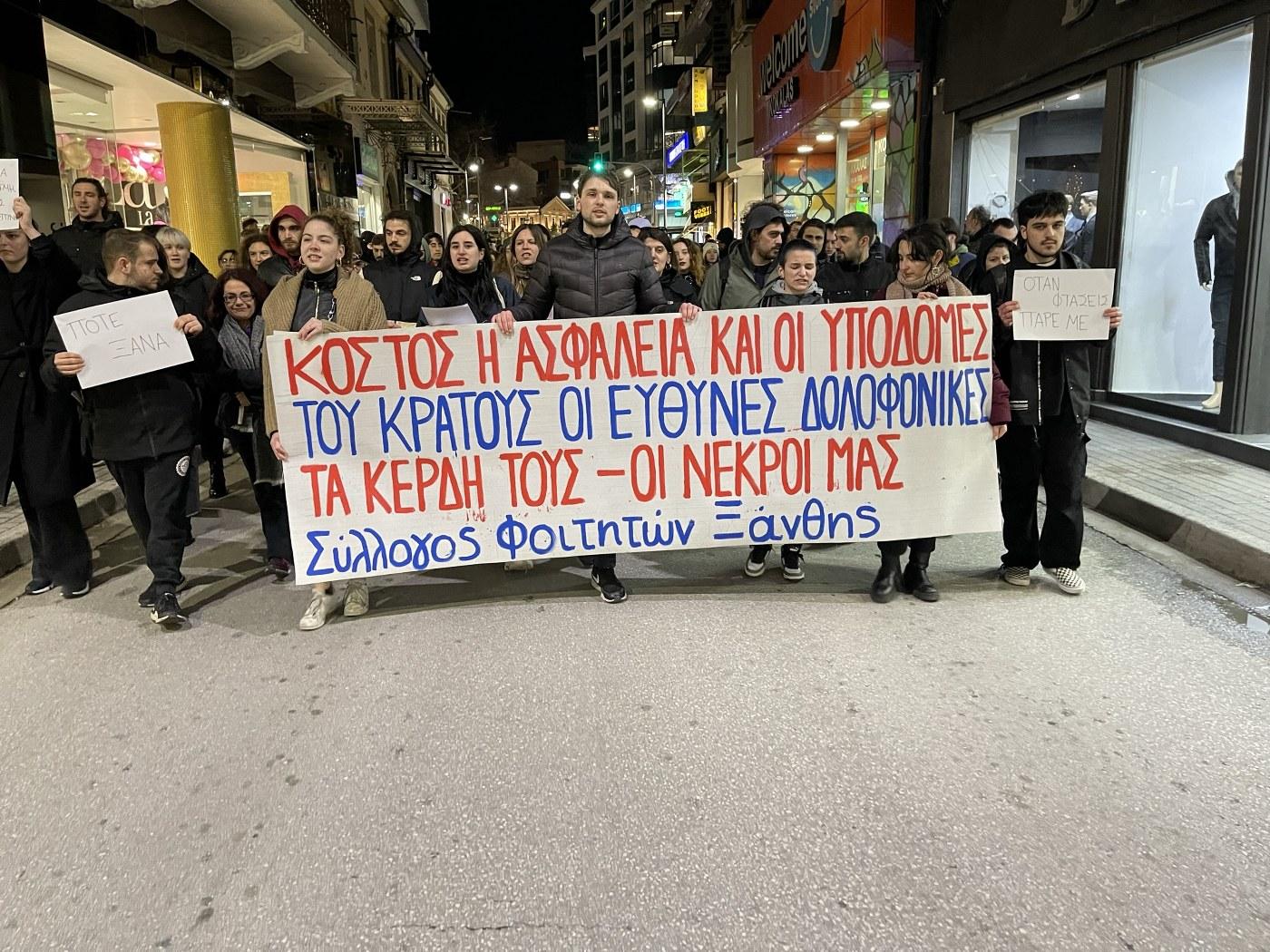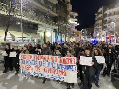 Μαζική και δυναμική πορεία των Φοιτητών της Πολυτεχνικής Σχολής Ξάνθης για το τραγικό δυστύχημα των Τεμπών πραγματοποιήθηκε το απόγευμα της Πέμπτης στους κεντρικούς δρόμους και την κεντρική πλατεία της πόλης με συνθήματα κατά:
