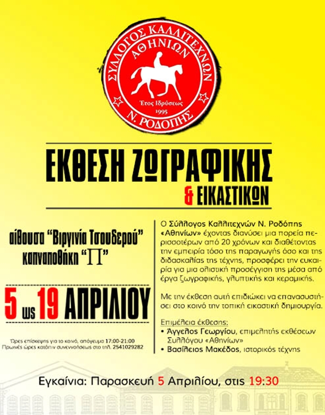 Να υπενθυμίσουμε πως ο Σύλλογος Καλλιτεχνών Ν. Ροδόπης «Αθηνίων» έχοντας διανύσει μια πορεία περισσοτέρων από 20 χρόνων και διαθέτοντας την εμπειρία τόσο της παραγωγής όσο και της διδασκαλίας της τέχνης, προσφέρει την ευκαιρία για μια ολιστική προσέγγιση της μέσα από έργα ζωγραφικής, γλυπτικής και κεραμικής.