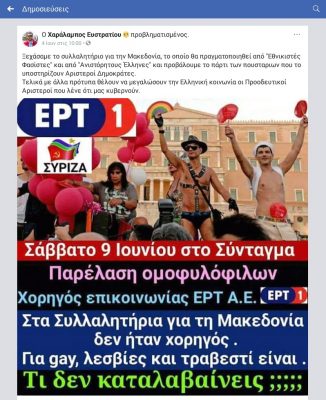 «Ξεχάσαμε το συλλαλητήριο για την Μακεδονία, το οποίο θα πραγματοποιηθεί από «Εθνικιστές Φασίστες» και από «Ανιστόρητους Έλληνες» και προβάλουμε το πάρτι των πουσταριων που το υποστηρίζουν Αριστεροί Δημοκράτες.