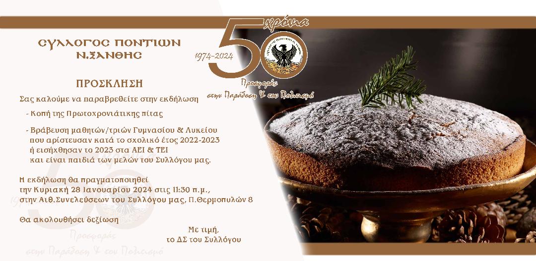 Η εκδήλωση θα πραγματοποιηθεί την Κυριακή 28 Ιανουαρίου 2024 στις 11:30 πμ στην Αίθουσα Συνελεύσεων του Συλλόγου μας, Π. Θερμοπυλών 8.