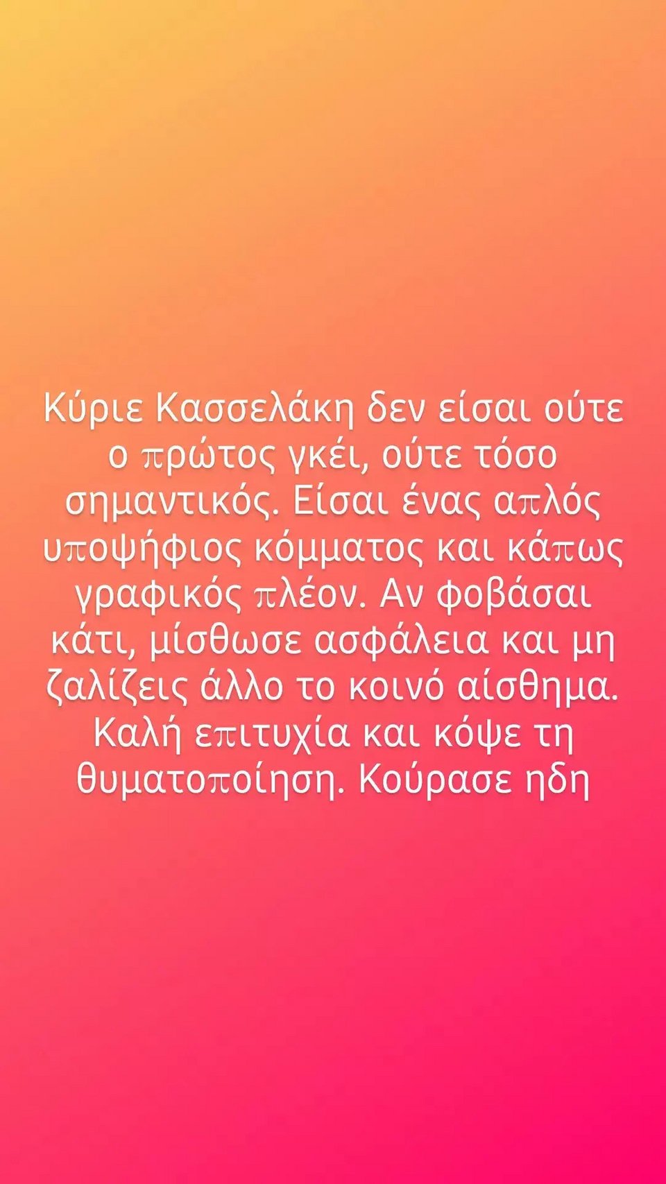 «Κύριε Κασσελάκη δεν είσαι ούτε ο πρώτος γκέι, ούτε τόσο σημαντικός. Είσαι ένας απλός υποψήφιος κόμματος και κάπως γραφικός πλέον», γράφει συγκεκριμένα ο Λάμπρος Κωνσταντάρας σε story που