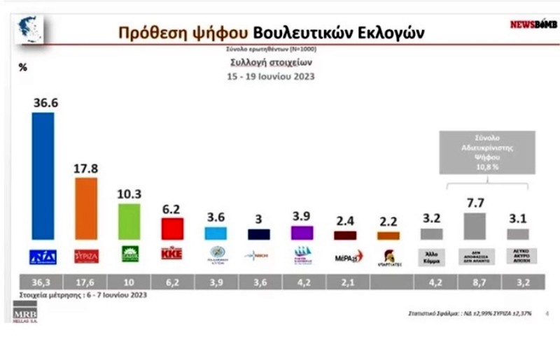 Τα αποτελέσματα δημοσκόπησης της MRB για τις εκλογές της 25ης Ιουνίου δίνουν σταθερά μεγάλο προβάδισμα και αυτοδυναμία στη ΝΔ.