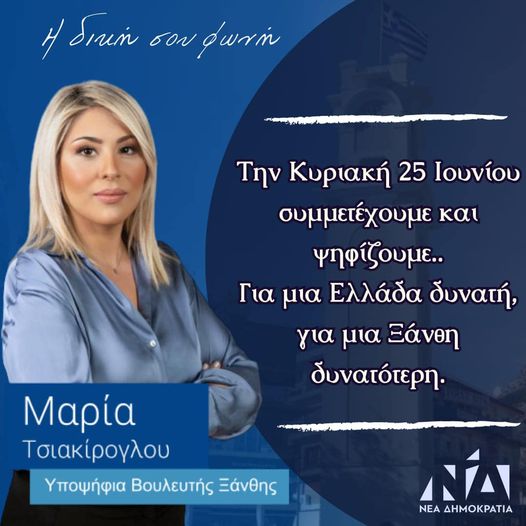 «Θα είμαι η φωνή Σας… Θα αγωνιστώ για τον Τόπο μας και την επίλυση των προβλημάτων που έχουμε, Μαζί θα πετύχουμε πολλά…», τόνισε χαρακτηριστικά η υποψήφια βουλευτής της Ν.Δ. Ν. Ξάνθης.