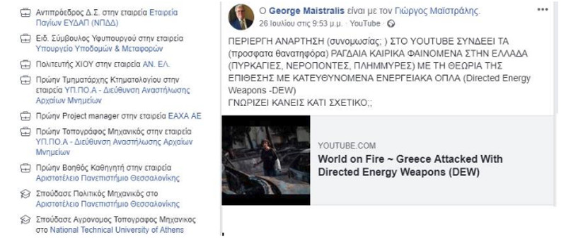 Ο Γιώργος Μαϊστράλης γράφει ότι βλέπει περίεργα βίντεο και αναρτήσεις στο YouTube, που συνδέουν τα πρόσφατα θανατηφόρα ακραία καιρικά φαινόμενα στην Ελλάδα (φωτιές, νεροποντές, πλημμύρες) με τη θεωρία της επίθεσης με «κατευθυνόμενα ενεργειακά όπλα»…