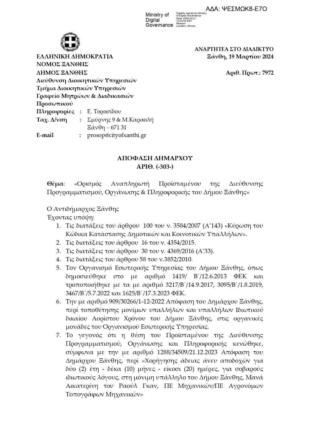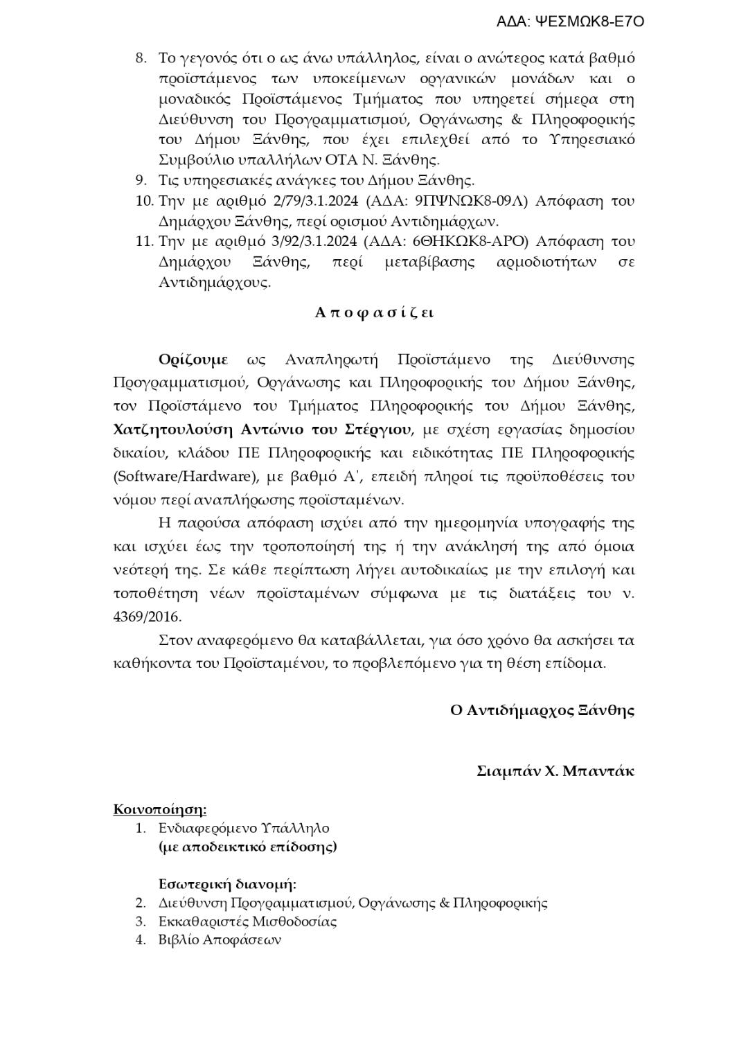 Θέμα: «Ορισμός Αναπληρωτή Προϊσταμένου της Διεύθυνσης Προγραμματισμού, Οργάνωσης & Πληροφορικής του Δήμου Ξάνθης»